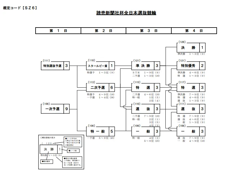「特別優秀」 「決勝」前の合計2レース。「準決勝」各レース4 – 6着9名と、二次予選敗退選手による3日目「特選」各レース1 – 3着9名の18名により行われる。