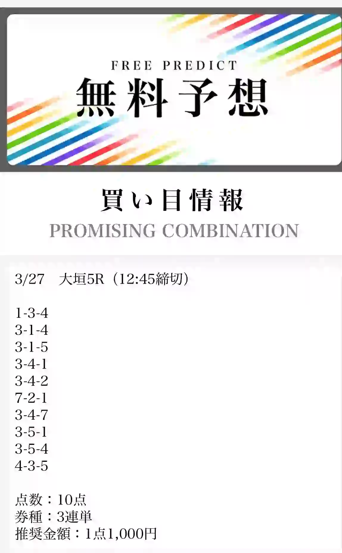 | 3月27日 | 大垣5R | 11,600円 | +1,600円 | 画像 |