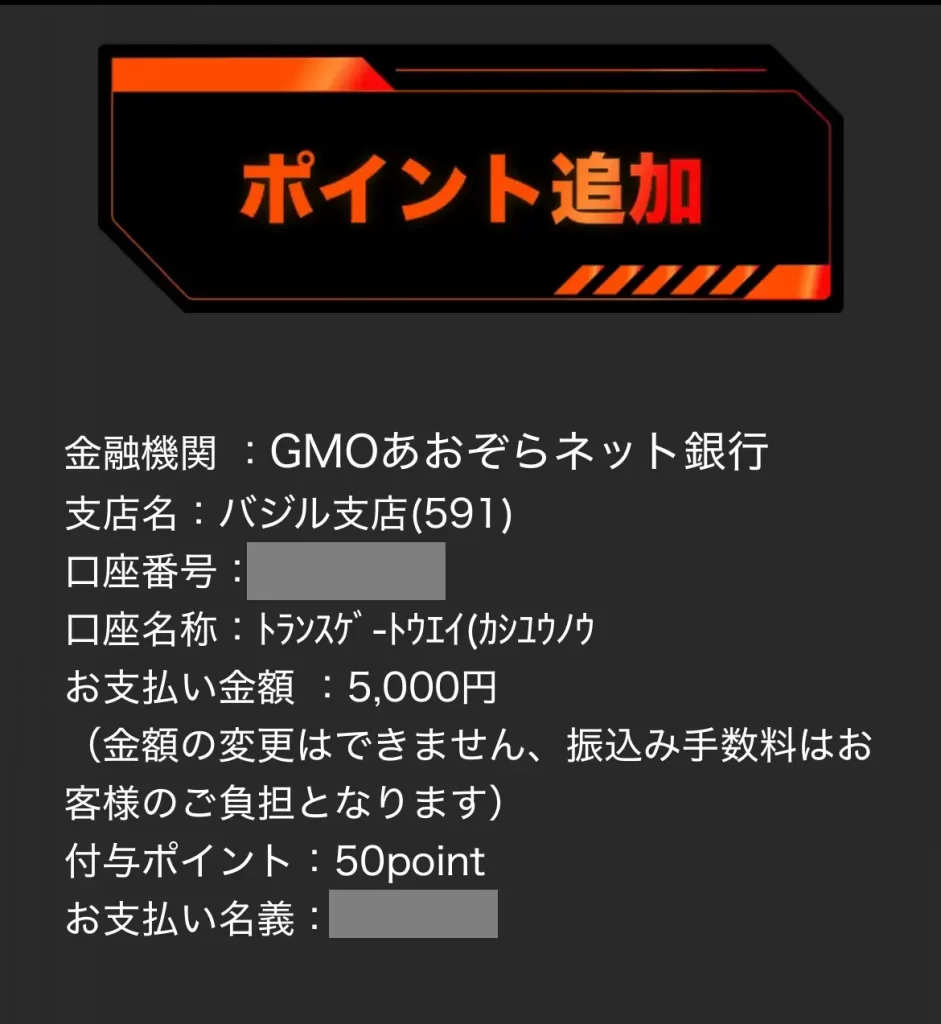 「銀行振込はこちら」をタップすると振込口座の番号が表示されるぞ。