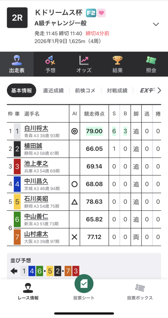 | 2枠単 | 1着と2着になる選手の枠単を着順通りに当てる |