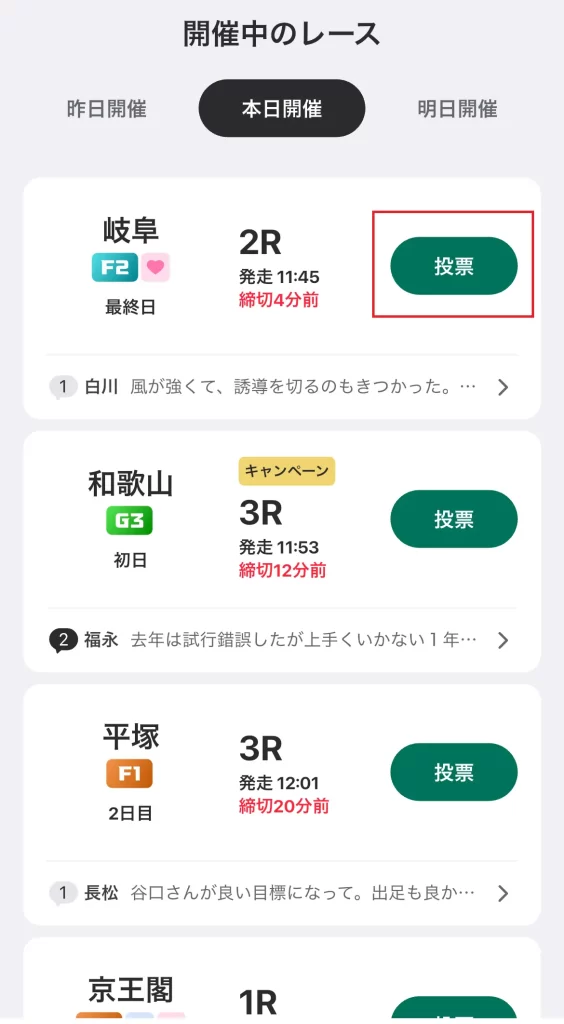 その日の投票可能レースが表示される!